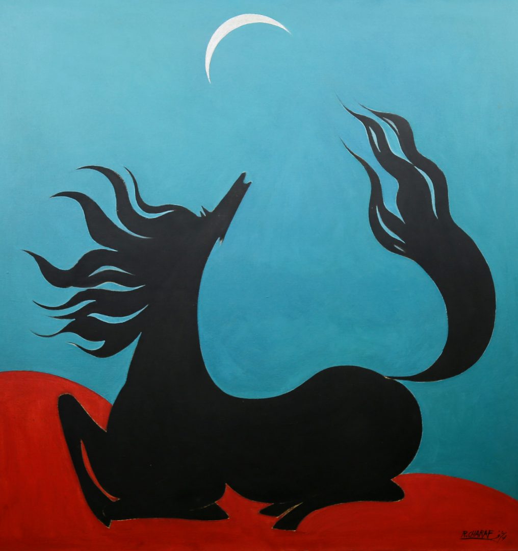 Inspired by Western expressionism and effected by cultural and social issues around him, Rafic Charaf was sensitive to both the human struggle and issues within Lebanon. Throughout many phases in his career, he painted subjects such as the folk hero, landscapes and calligraphy. This beautiful piece of Rafic Charaf carries many of the themes he’s known for. “A neigh in a boundless blue” shows a stylized black horse-like figure on a red ground, silhouetted against a vivid turquoise sky. The creature’s mane and tail flow upward in long, flame-like shapes, giving it a sense of movement, spirit, and myth. It appears to be reaching or howling toward a crescent moon, which adds a poetic and almost mystical tone.