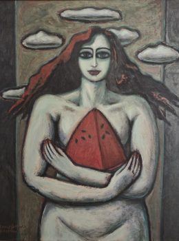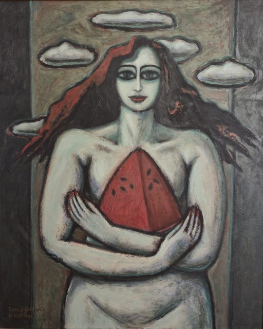 Known for the boldness in his work coupled with political and social commentary, Hassan Jouni’s pieces depict subject matter that is both lyrical and narrative. His usage of color is expressive of inner emotions or possibly symbolic in meaning. In Untitled (Watermelon Eaters), the energetic brushstrokes portray the joyous moment of three men vigorously eating watermelon.