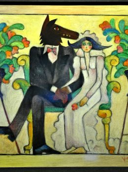Known for his figurative works, Wajih Wahba paints with a gestural hand. Smooth flowing brush strokes of velvety colors give his work a rich tonality like in “Untitled.” His expressionist style imbues emotion and the figures look as if they are deep in conversation.