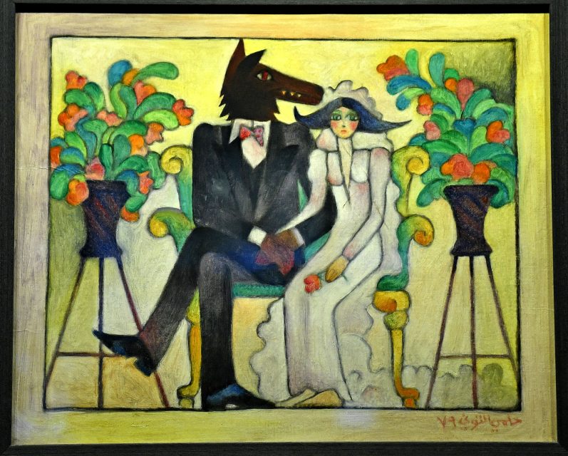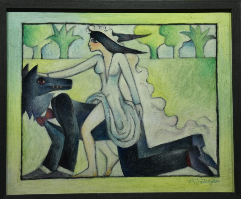 Expressionist Mohsen Shalaan unleashed his emotion through oil paint, ink and pencils combining symbols and folkloric myths to ultimately create a surrealist experience. Reminding viewers of a film scene where the main character has a memory or flashback “Untitled” might serve as way to relate to our own nostalgia.