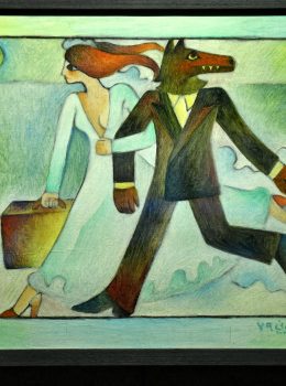 Egyptian artist Helmi Eltouni is well known for his playful visual narratives, symbolic iconography and stylistic outlined figures painted in vibrant colors. Working with themes from Egyptian folklore and heritage, he also addresses current social issues. In “Gafnoho,” he is referencing the song by Abdel Wahab, where he is struck by her beautiful eyes.