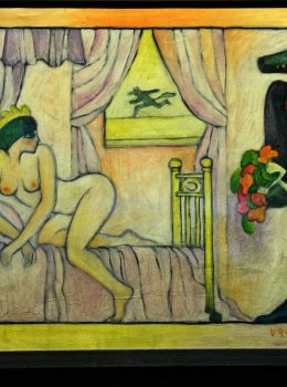 Jaber Alwan’s work addresses the human condition, conflicts in his homeland and icons of Iraqi culture such as the late Dia Majeed, and the 20th-century poet, Muhammad Mahdi al-Jawahiri. Typical of the artist’s penetrating dark palette and surreal colors, “Untitled” displays the artist’s characteristic thick, almost sculptural, brushwork which accentuates the drama of the figure inside the interior scene. The features on the face have a neutral expression, with the color symbolism, body motion and other elements inferring the work’s intent.