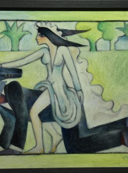 Characterized by a strong combination of impressionism and nativism with distinct Egyptian motifs, Gameel Shafik’s romantic and poetic work focuses on a central form with few surrounding details. His pictures often reveal reoccurring themes: the struggle between good and evil, animals as symbols of fertility; as well as relationships and the external forces that effect them. In “Untitled” the solid form of the woman holds a fish, a symbol which represents the good forces in the world.