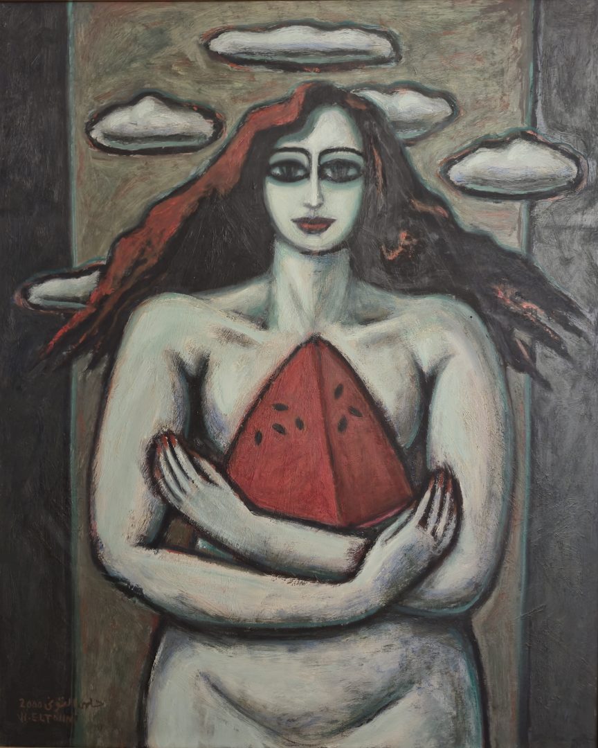 A monumental female figure cradles a watermelon shaped like a pyramid, a potent symbol of life, fertility, homeland, and nourishment. The frontal pose, elongated form, and solemn expression recall ancient Egyptian wall paintings and Coptic iconography, transforming the everyday into a timeless, symbolic image of protection and continuity.